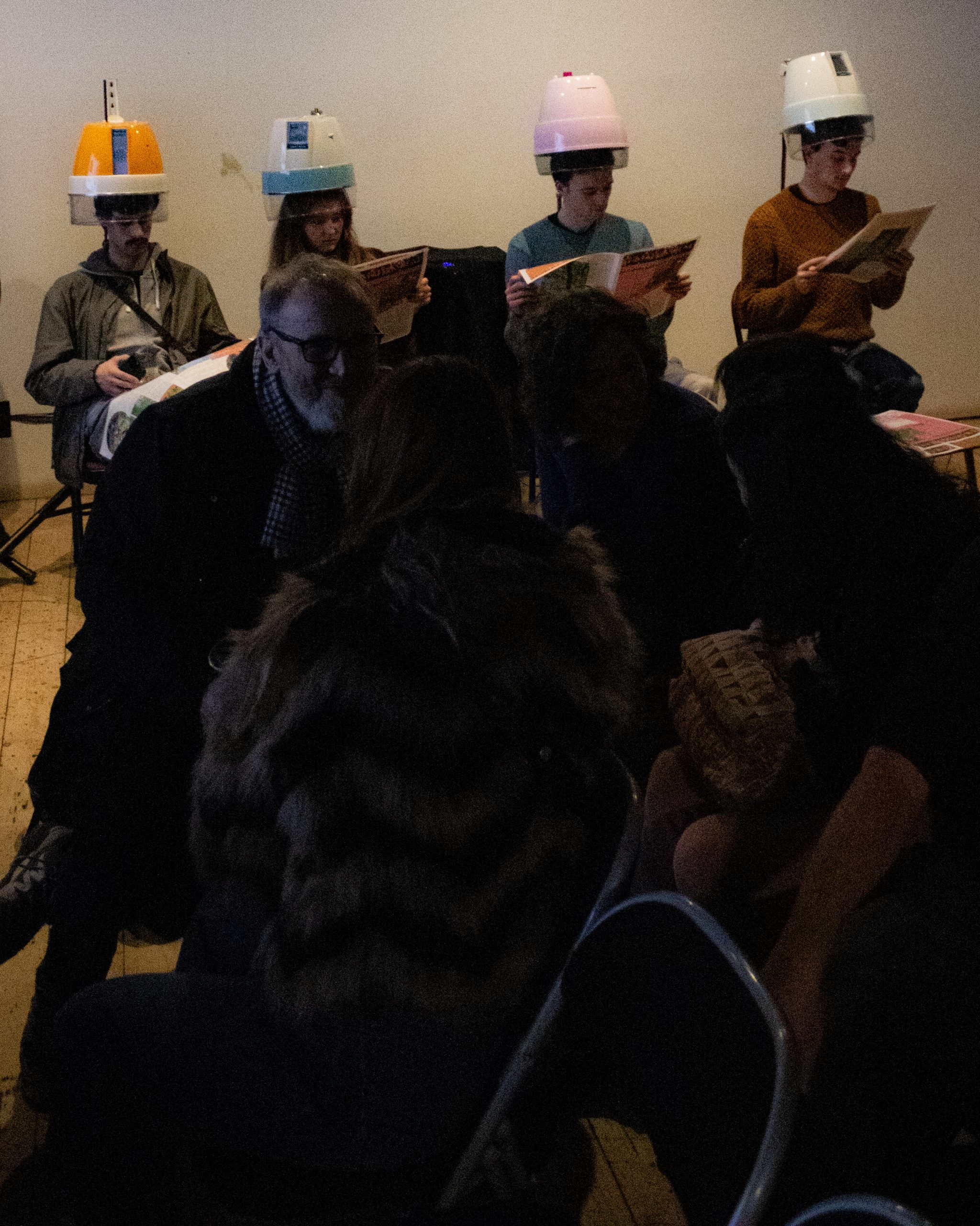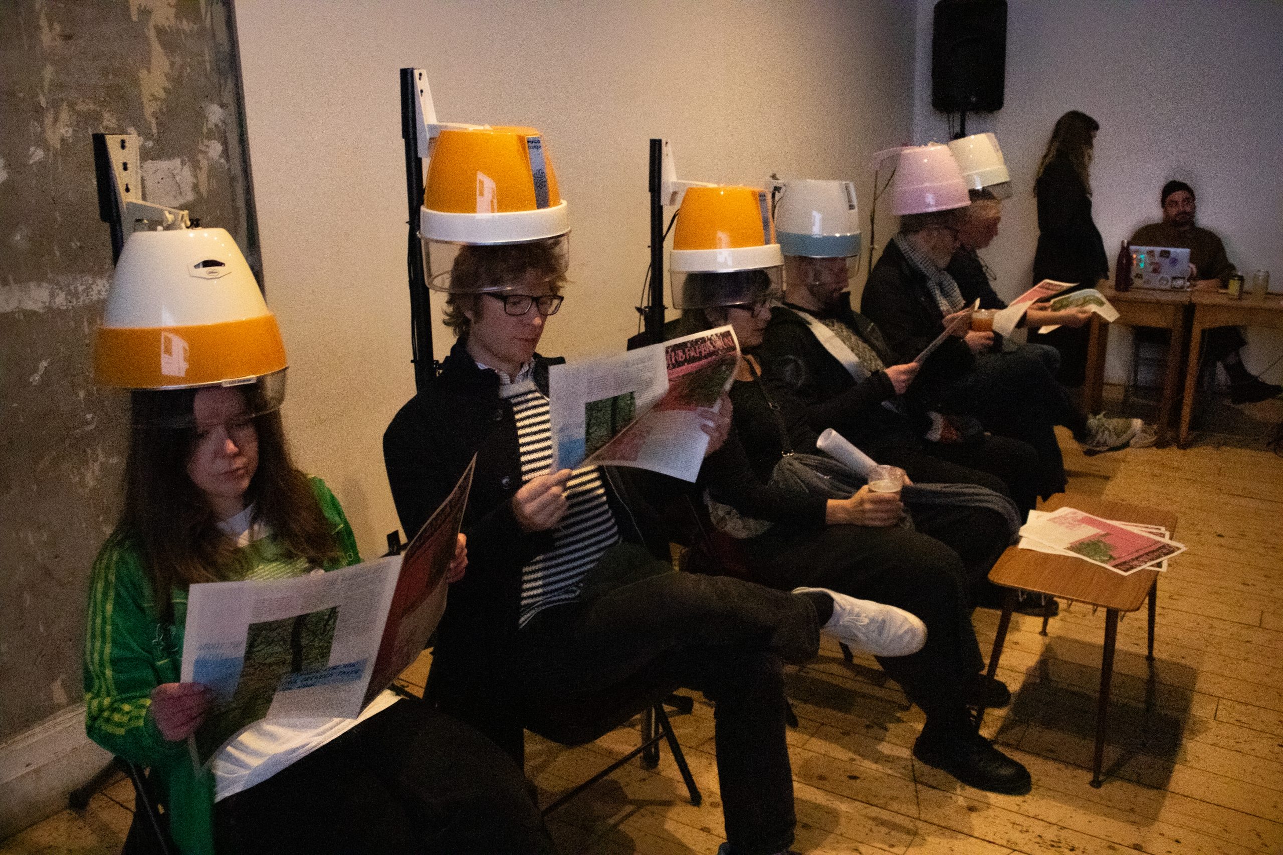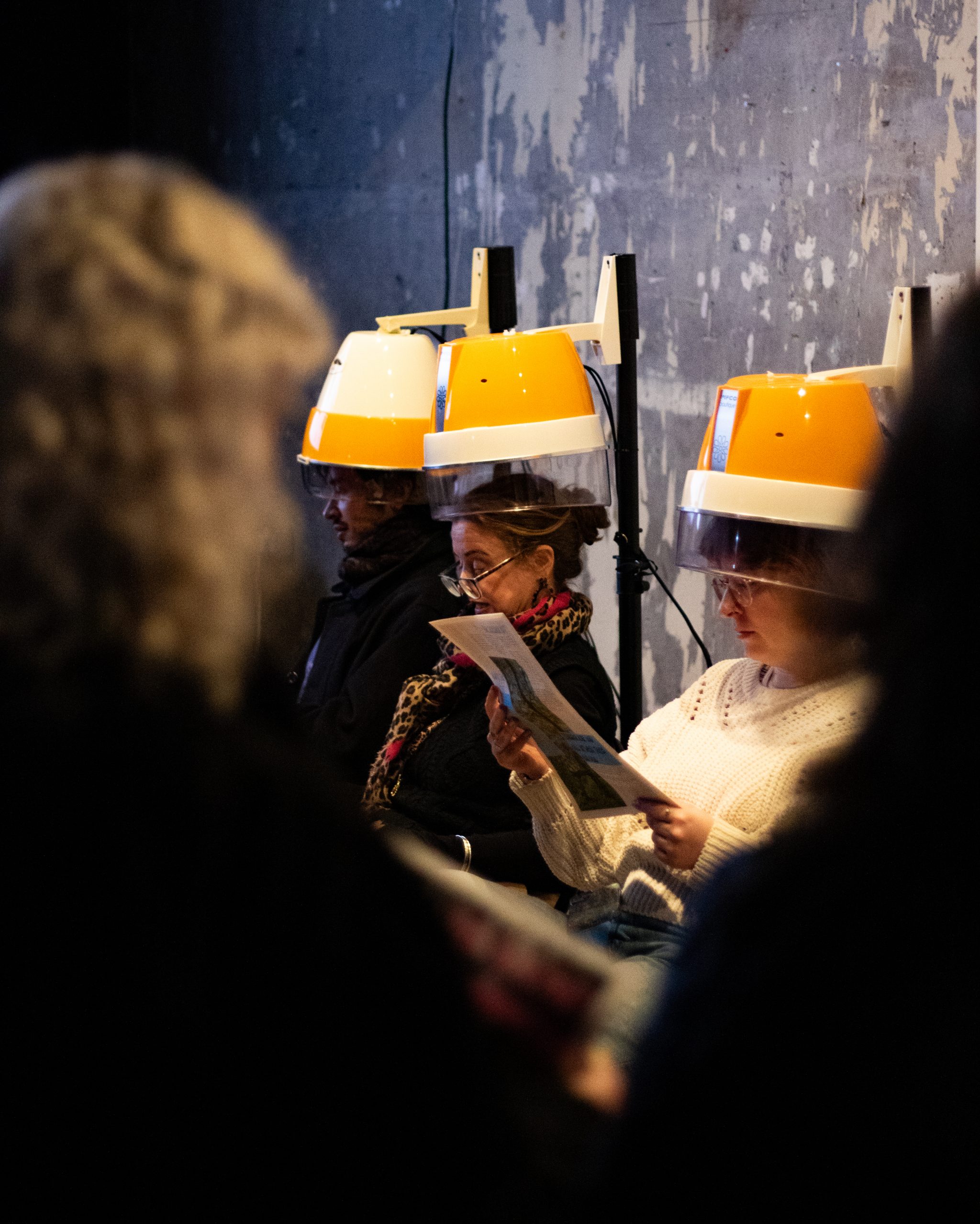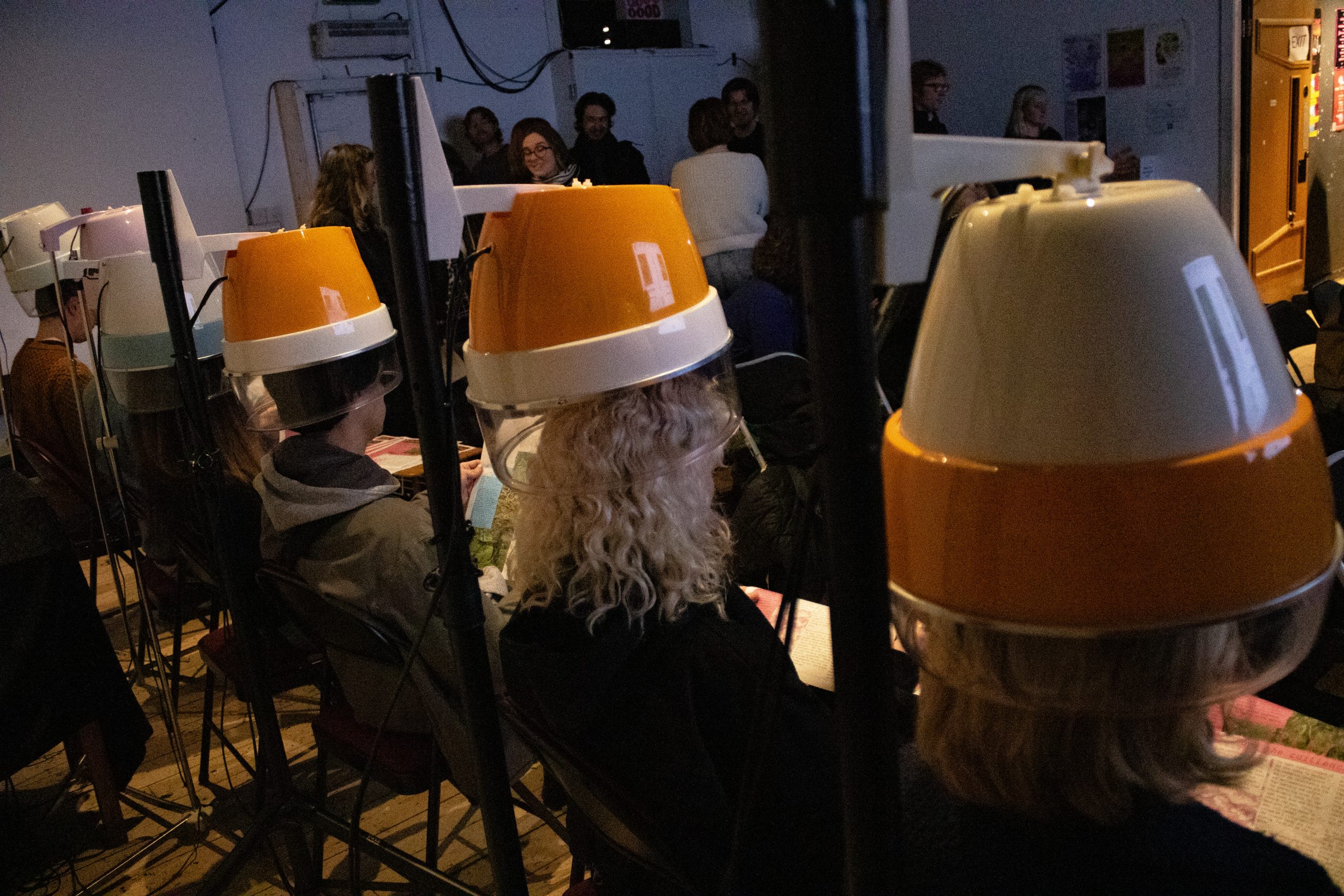 Parlour of Psithurism is a sound installation by artist Beth Robertson that explores the feminist nature of ecology, transforming repurposed hairdryer hoods into playful, intimate listening spaces. Psithurism – the sound of wind whispering through trees, from the Greek word for ‘whisper’ – is brought to life through recordings of Scotland’s temperate rainforests, played through speakers embedded within each hood. By reimagining the familiar setting of the salon as a site of care and conversation, Robertson invites audiences to listen closely to these soughing, tree-borne voices as if they were companions to nurture, learn from, care for and build communities with.”